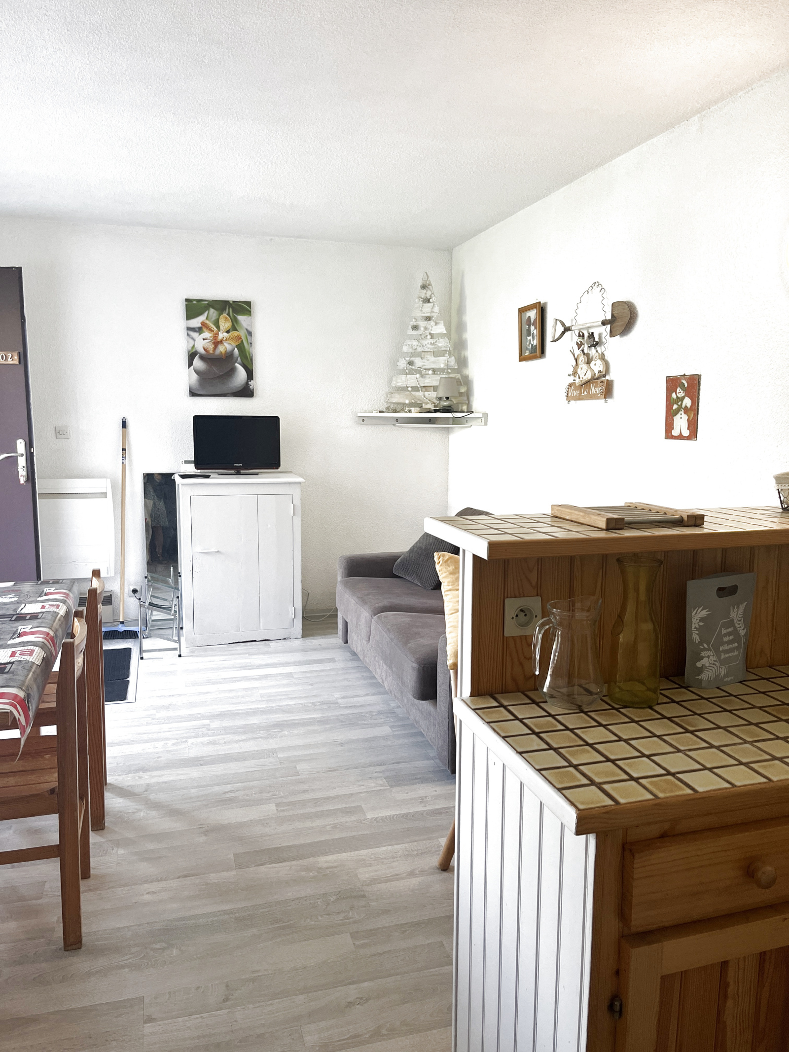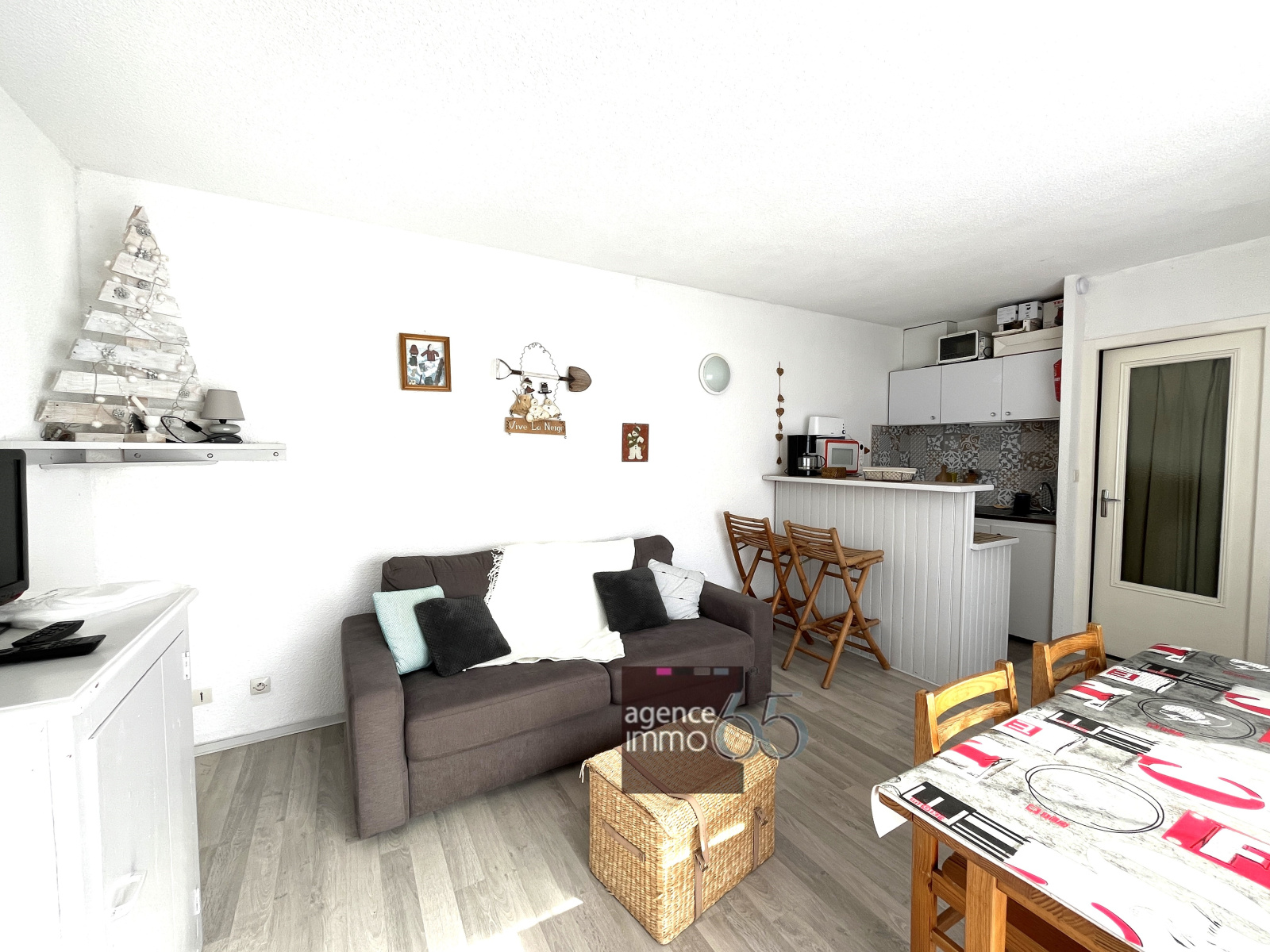 Vendu meublé, une belle pièce de vie avec kitchenette espace lumineux avec coin salon, une chambre cabine avec lits superposés placards de rangements, une salle de bain avec wc